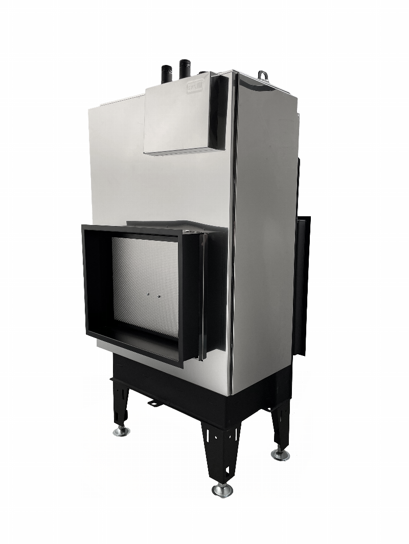 Dzięki palenisku wyłożonemu materiałem akumulacyjnym Carcon, wyprodukowanemu specjalnie dla naszej firmy, uzyskano wysoką czystość i sprawność spalania oraz bardzo ładny widok na ogień. Korpus wkładu kominkowego jest pokryty izolacją, wkład posiada w standardzie podwójne przeszklenie. To również powoduje maksymalną wydajność ciepła przekazywanego do wymiennika.
