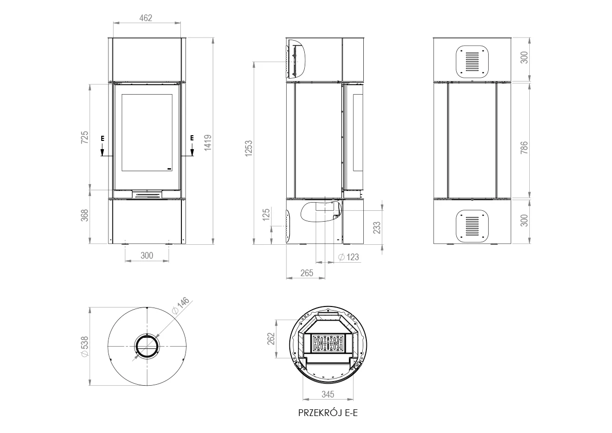 - Żeliwny wylot spalin montowany z góry lub z tyłu kominka.