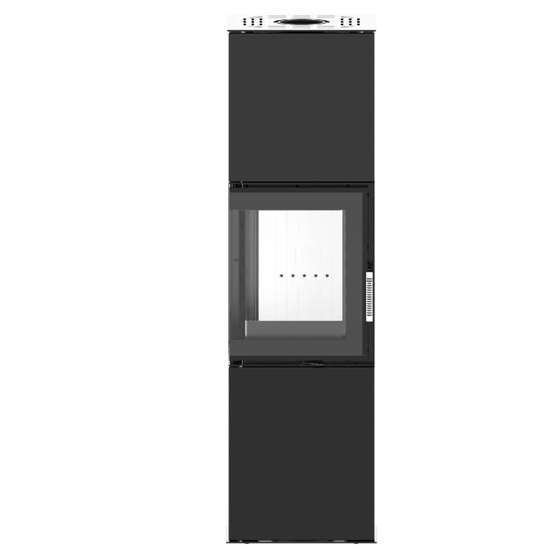 Kominek GABI umożliwia podłączenie odprowadzenia spalin zarówno od góry, jak i z tyłu. Tylne panele można zamieniać miejscami, co daje więcej możliwości montażu. Drzwi kominka wykonane są z polerowanej obustronnie ceramiki odpornej na temperatury do 800°C, osadzonej w sztywnej ramie ze stali kotłowej.
