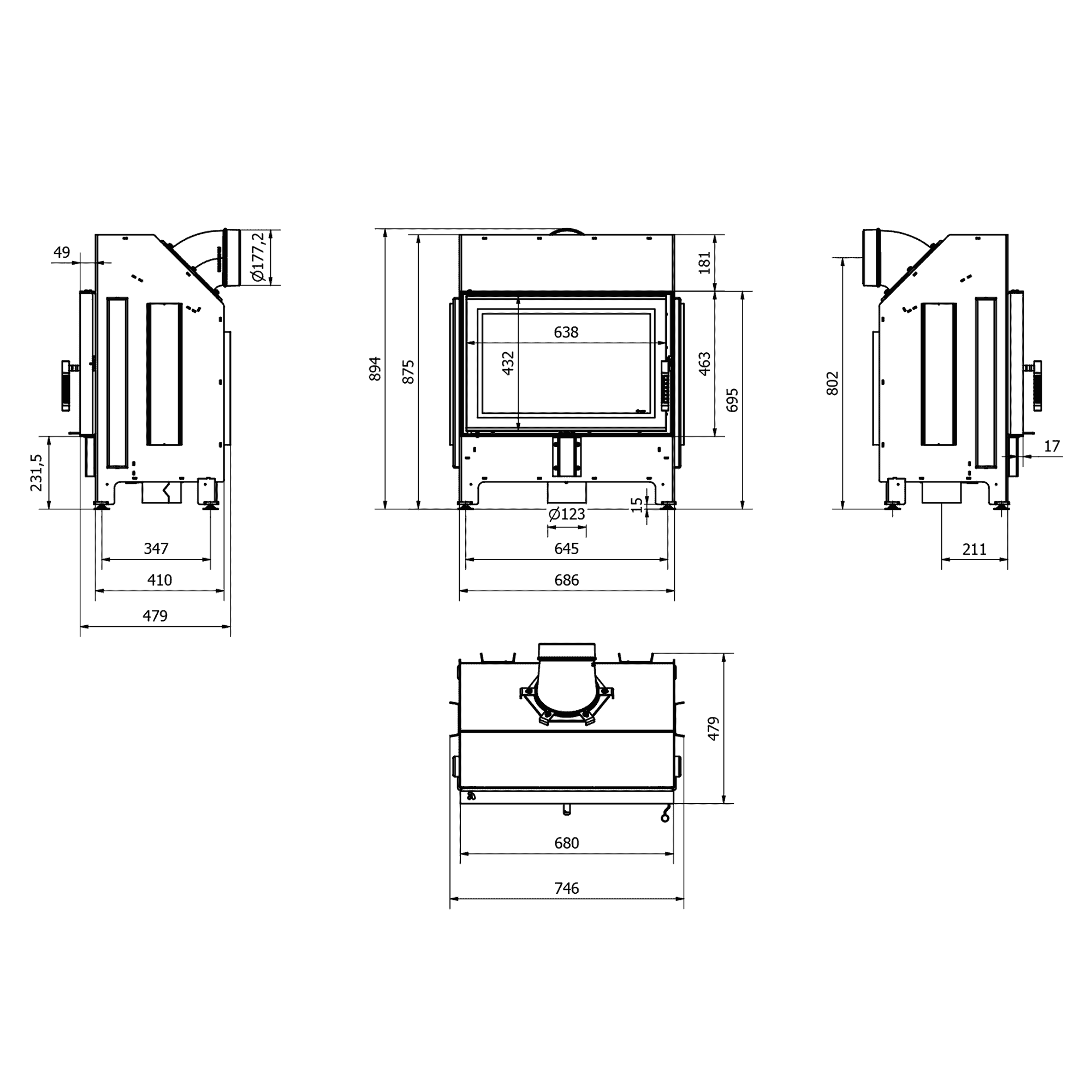 Kominek KRATKI ZIBI ECO wkład kominkowy moc 9,9 kW Ø 180 czarne wyłożenie