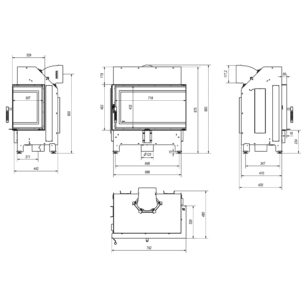 Kominek KRATKI ZIBI ECO wkład kominkowy narożny prawy moc 9,9 kW Ø 180