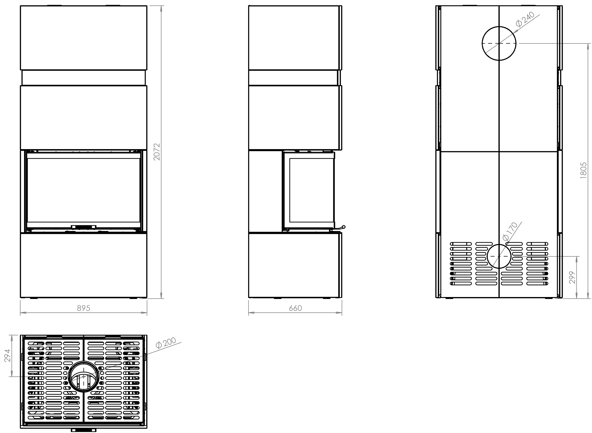 - Wkład wyposażony w żeliwny czopuch Ø200 z regulacją 360 stopni, dający możliwość odprowadzania spalin w każdym kierunku.