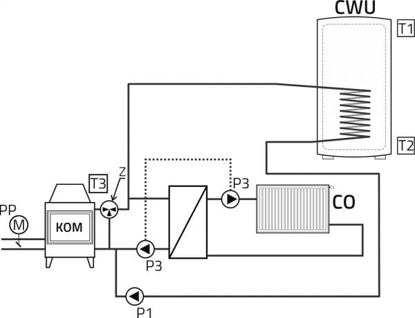 RT-08G - Zestaw sterujący z wyświetlaczem graficznym do obsługi układów grzewczych zasilanych z kominka z płaszczem wodnym, z regulacją dopływu powietrza do komory spalania za pośrednictwem przepustnicy i wyświetlaczem graficznym. Sterownik zapewnia automatyczną obsługę dwóch pomp obiegowych CO, oraz pompy ładującej układ CWU. Posiada trzy czujniki temp. wody – 1 czujnik zasadniczy do pomiaru w płaszczu wodnym kominka oraz 2 czujniki do układu CWU
