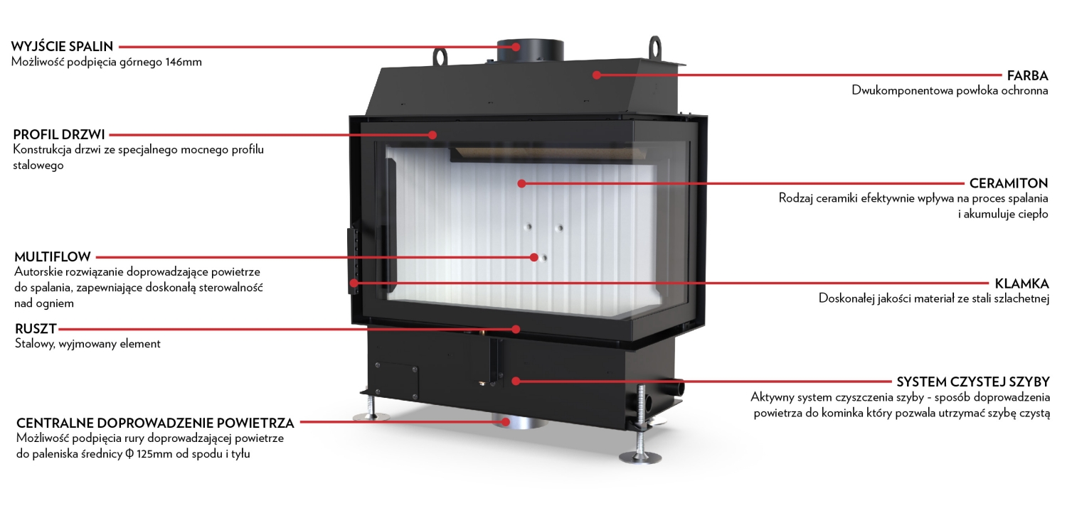 - MULTIFLOW - doprowadzenie powietrza do spalania, zapewniające doskonałą kontrolę nad ogniem