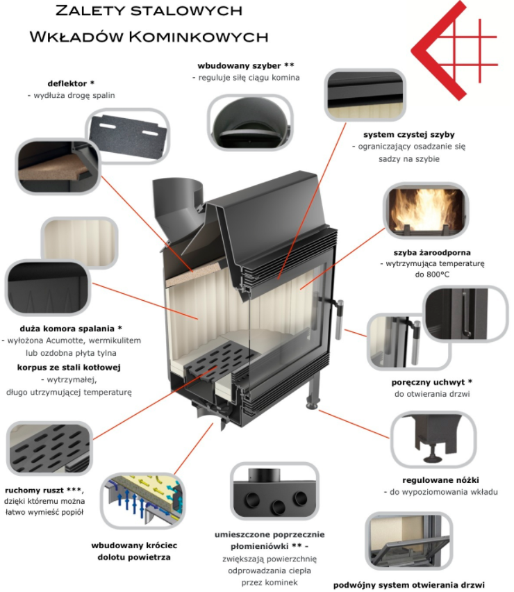 Front wkładu wyposażony w szybę żaroodporna wytrzymująca temperaturę do 800°C.